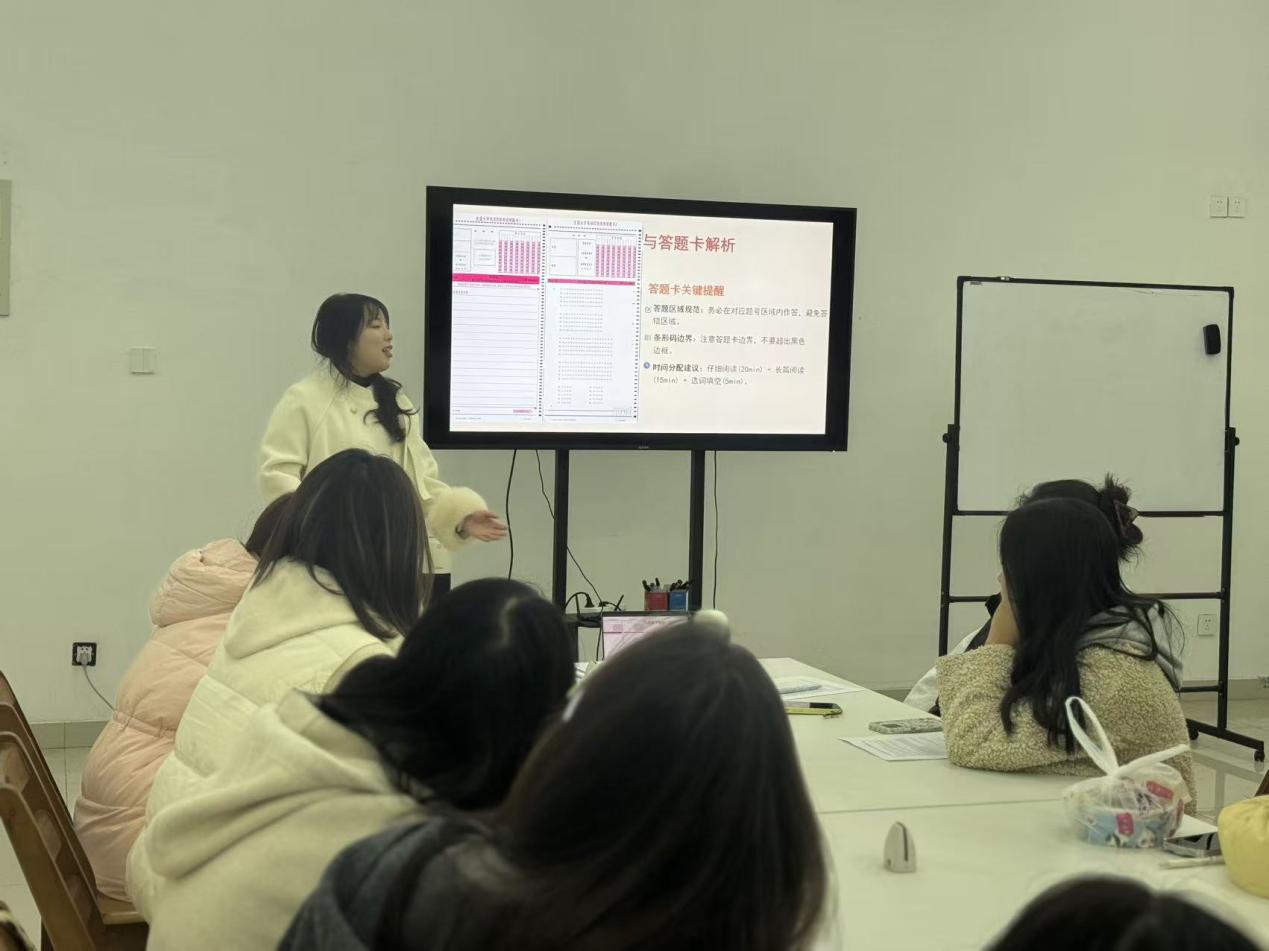为帮助同学们攻克英语四级阅读难关、缓解备考压力,12月1日,学院“豌豆荚”学业辅导站朋辈导师周蕊于博行楼N402面向全院学生开展“四级阅读‘小魔法’与焦虑漩涡告别术”主题课程,以实用技巧+心理疏导的双维模式,为四级备考注入“轻松能量”。(图为周蕊上课)课程围绕四级阅读核心模块展开,周蕊首先结合答题卡实例解析了考试流程与时间分配,明确“仔细阅读20分钟、长篇阅读15分钟、选词填空5分钟”的高效答题节奏。针对阅读三大题型,她拆解了不同题型的解题逻辑:细节题通过“关键词+定位词+限定词”三要素快速锁定原文;主旨题借助“首尾段转折处+高频词提炼”精准抓核心;同时总结了主旨题“范围扩大、细节干扰”等常见陷阱,用记忆口诀帮助同学们快速掌握技巧。(图为阅读理解三大题型总览)除了应试方法,课程特别设置“舒压互动环节”,结合备考常见焦虑场景,引导同学们用“任务拆解+正向暗示”的方式调节心态,将“怕出错”的紧张转化为“练技巧”的专注。现场同学表示,“不仅学到了‘瞪眼法’实战步骤,更学会了和备考焦虑‘和平共处