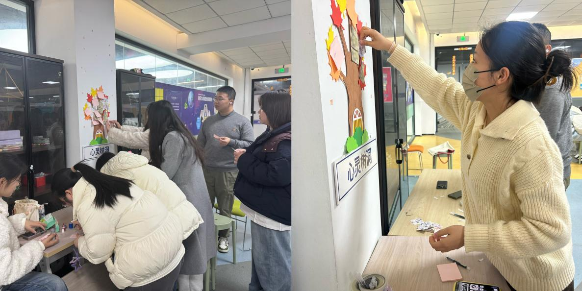 为强化大学生心理健康意识,提升心理调适与情绪管理能力,搭建真诚沟通、互助支持的交流平台,12月10日下午,由管理工程学院主办、学院二级心理辅导站承办、毅行旅行协会协办的第二届心灵游园会,在A32大学生活动中心一楼室内营地温情启幕。作为“一站式”学生社区心理健康教育的重要实践活动,本次活动吸引全校200余名学子踊跃参与,在沉浸式体验中开启治愈心灵、收获成长的趣味旅程。本次游园会以“心灵奇旅,探索无界”为主题,依托“一站式”学生社区育人载体,打破传统心理健康教育单一模式,将知识科普与趣味互动深度融合,设置知识展览区、创意表达区、团体活动区三大核心区域。活动现场,参与者领取专属“心灵游园会集章卡”,通过完成各区域活动打卡集章,解锁全方位心灵体验,在轻松氛围中学习心理知识、释放压力、凝聚团队力量。(图为知识展览区参与同学留言祝福)知识展览区的主题展板系统呈现心理健康常识、常见心理困扰应对技巧及科学干预方法,供学子驻足学习;“解忧心愿树”成为热门打卡点,同学们写下鼓励话语、温暖祝福与自我期许悬挂于